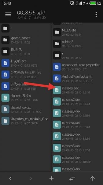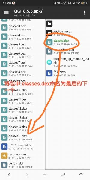 1. 点击查看,看看该软件的最大classes最多多少个,然后重命名模块包内的classes.dex,在原软件最多classes的基础上+1,例如QQ最大classes是15个,那么模块包内的classes就重命名为classes16.dex,然后添加进去